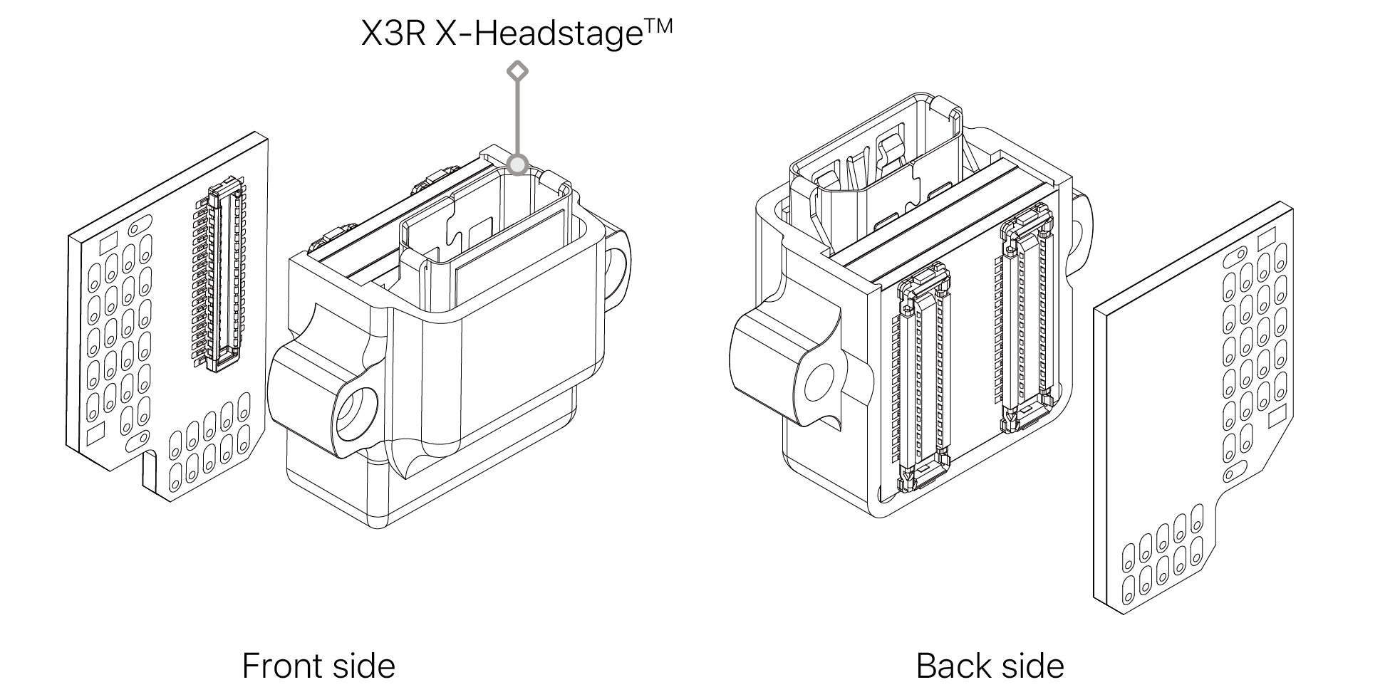 This 32-channel EIB is designed for use with X3 headstages, with the EIB extending from the right side of the headstage.