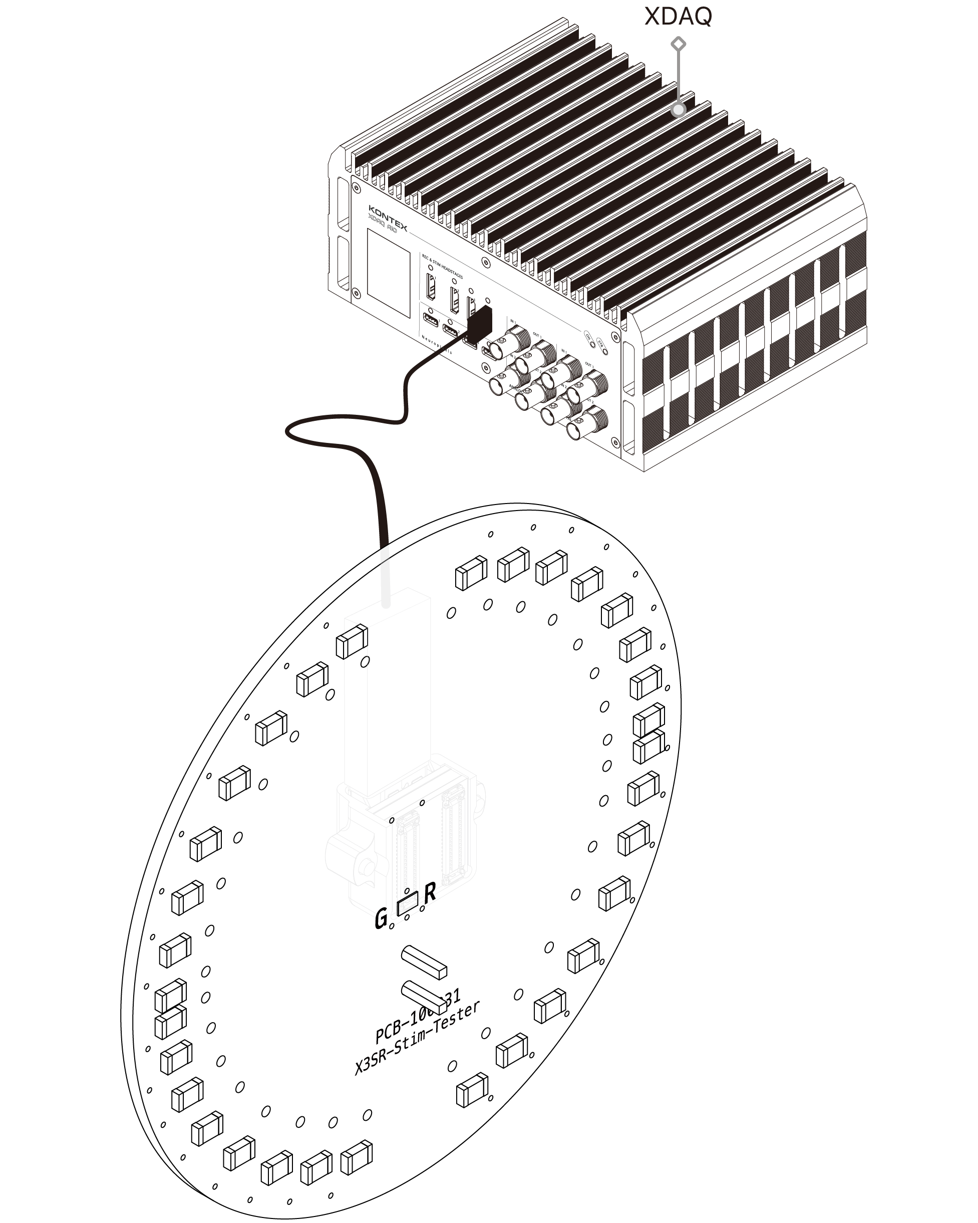 Use this module with a dummy 1kOhm resistive load to verify the stimulus waveform generated by the X3SR headstages.
